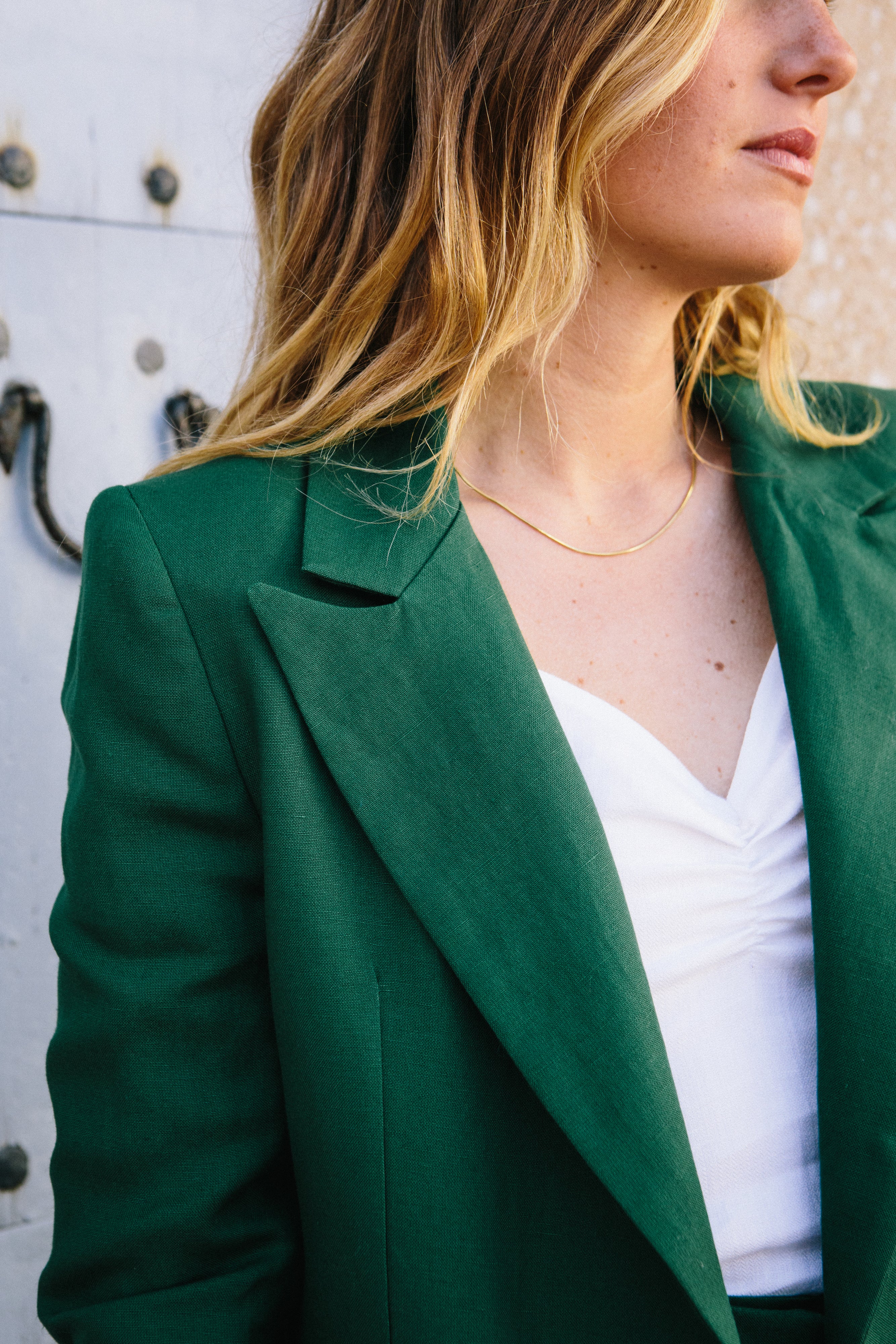 De structure douce, ce modèle décontracté est confectionné dans un mélange de lin et de lyocell dont les fils ont été teints pour créer une couleur profonde dans le tissu. Entièrement doublé, il est doté d'un revers en pointe et d'un simple bouton bas fait de nacre. Les épaules et les poches rembourrées sont conçues pour un confort décontracté. Associez-le au pantalon Selena vert de la marque pour une nouvelle interprétation de la mode durable.
