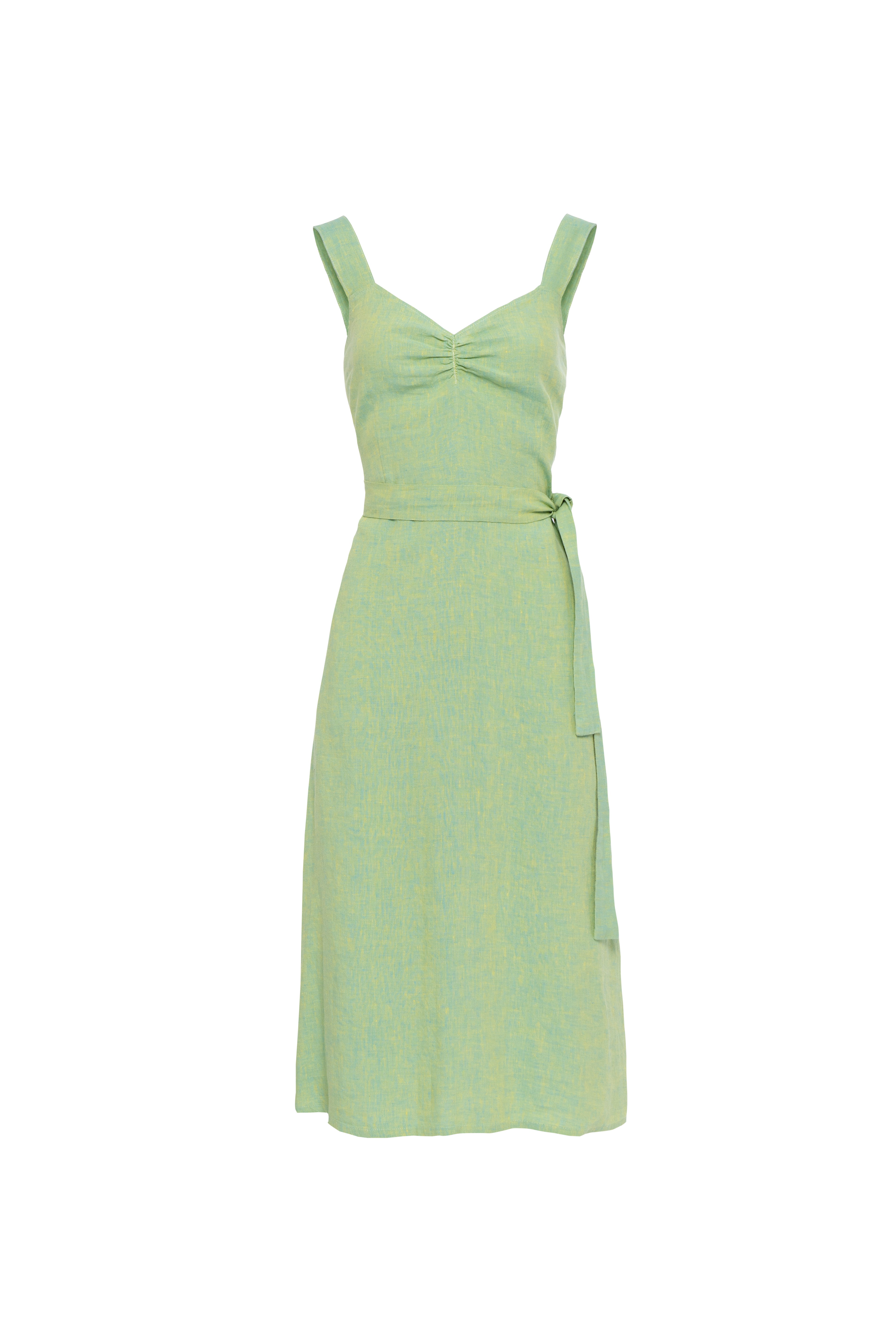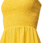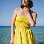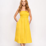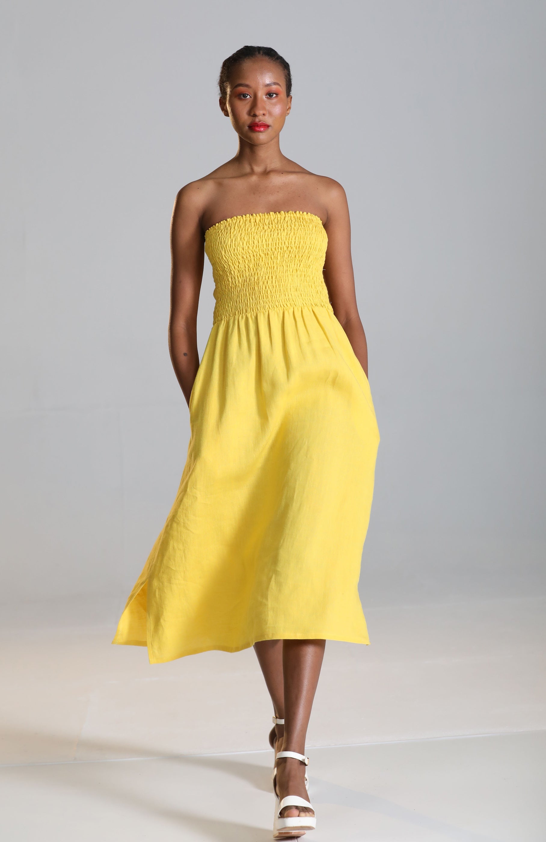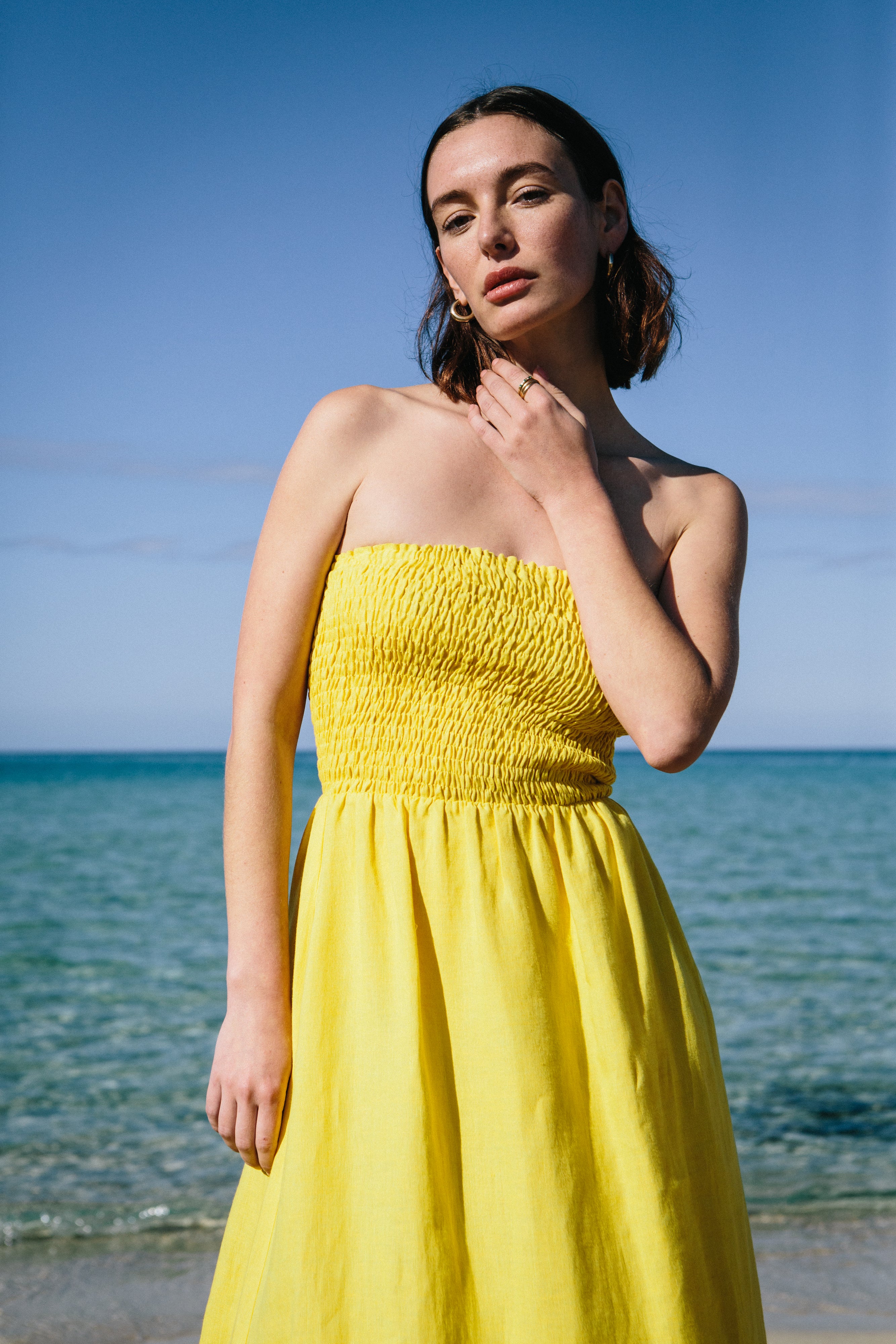 The warm yellow Arena dress has a fitted shirred bodice with a square neckline that falls into a midi-length skirt with pockets and two slits on each side. Handmade in Ireland from linen is ideal for an effortless summer style during the warm months. - Strapless Linen midi dress - Shirring fitted top - Pockets - Sits on both sides - 100% Irish Linen