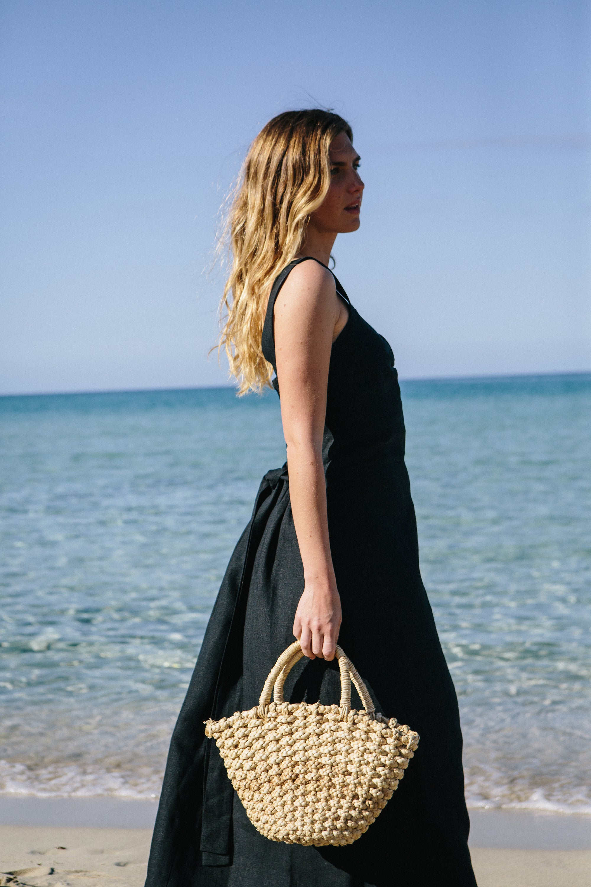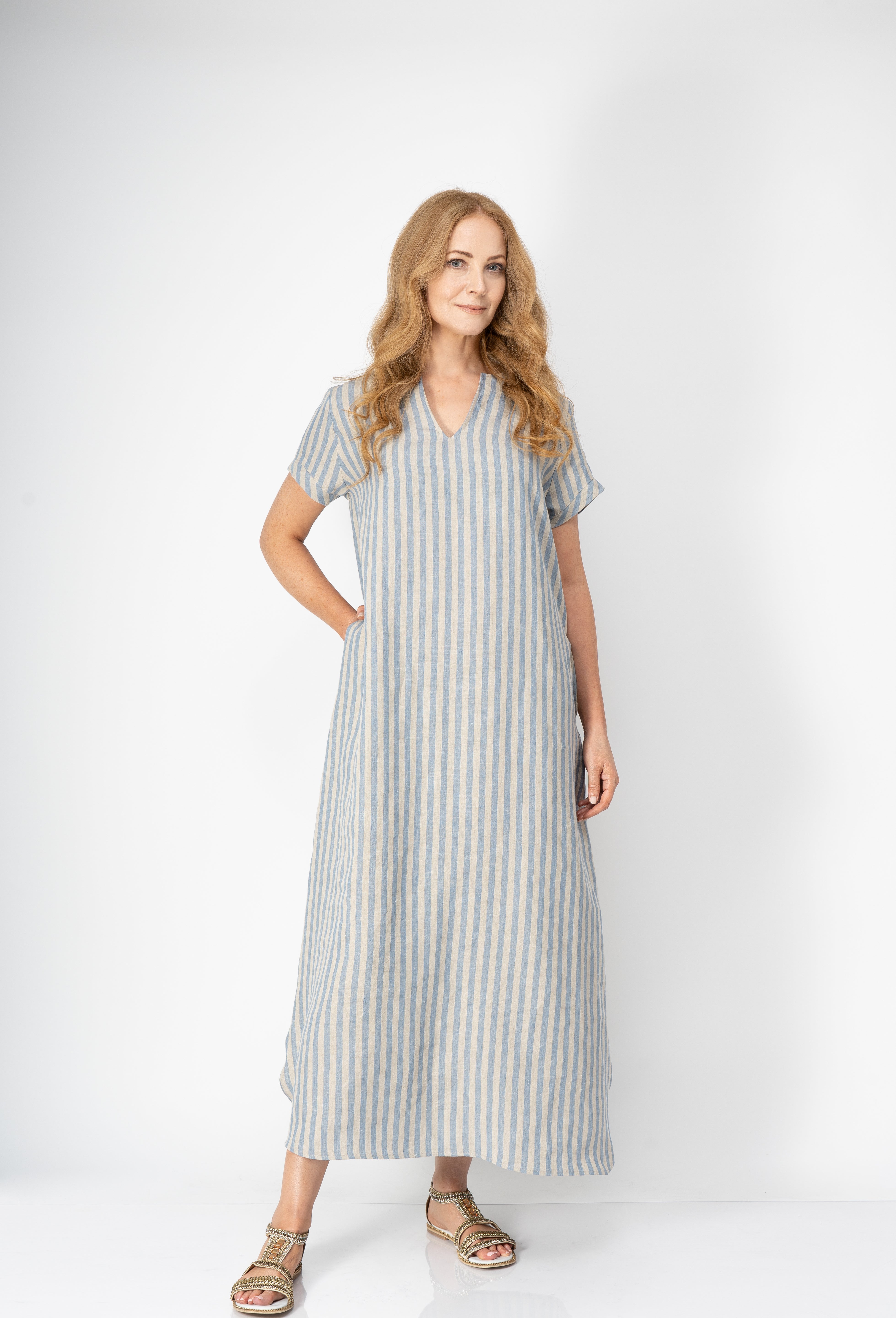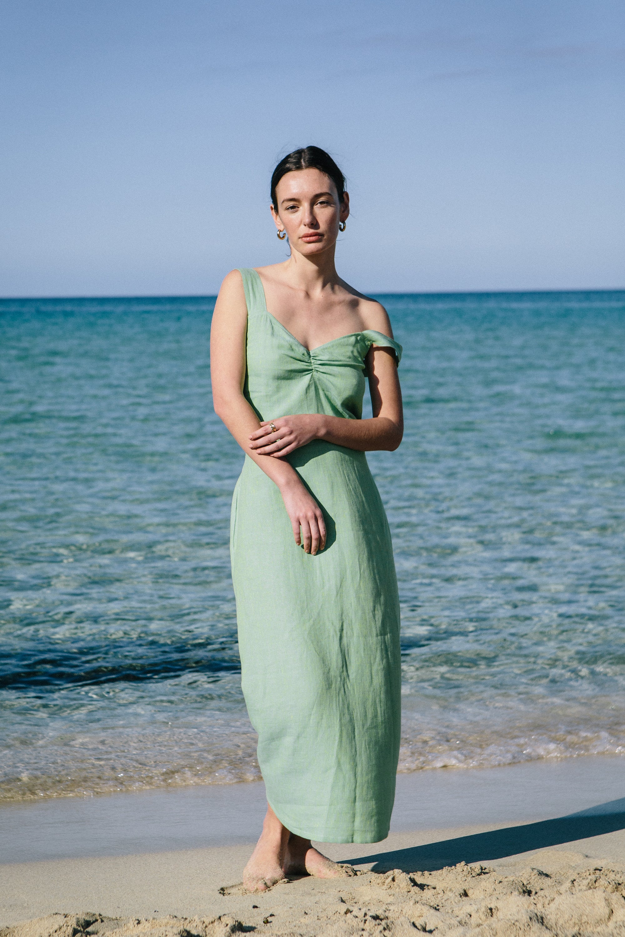 The warm yellow Arena dress has a fitted shirred bodice with a square neckline that falls into a midi-length skirt with pockets and two slits on each side. Handmade in Ireland from linen is ideal for an effortless summer style during the warm months. - Strapless Linen midi dress - Shirring fitted top - Pockets - Sits on both sides - 100% Irish Linen