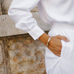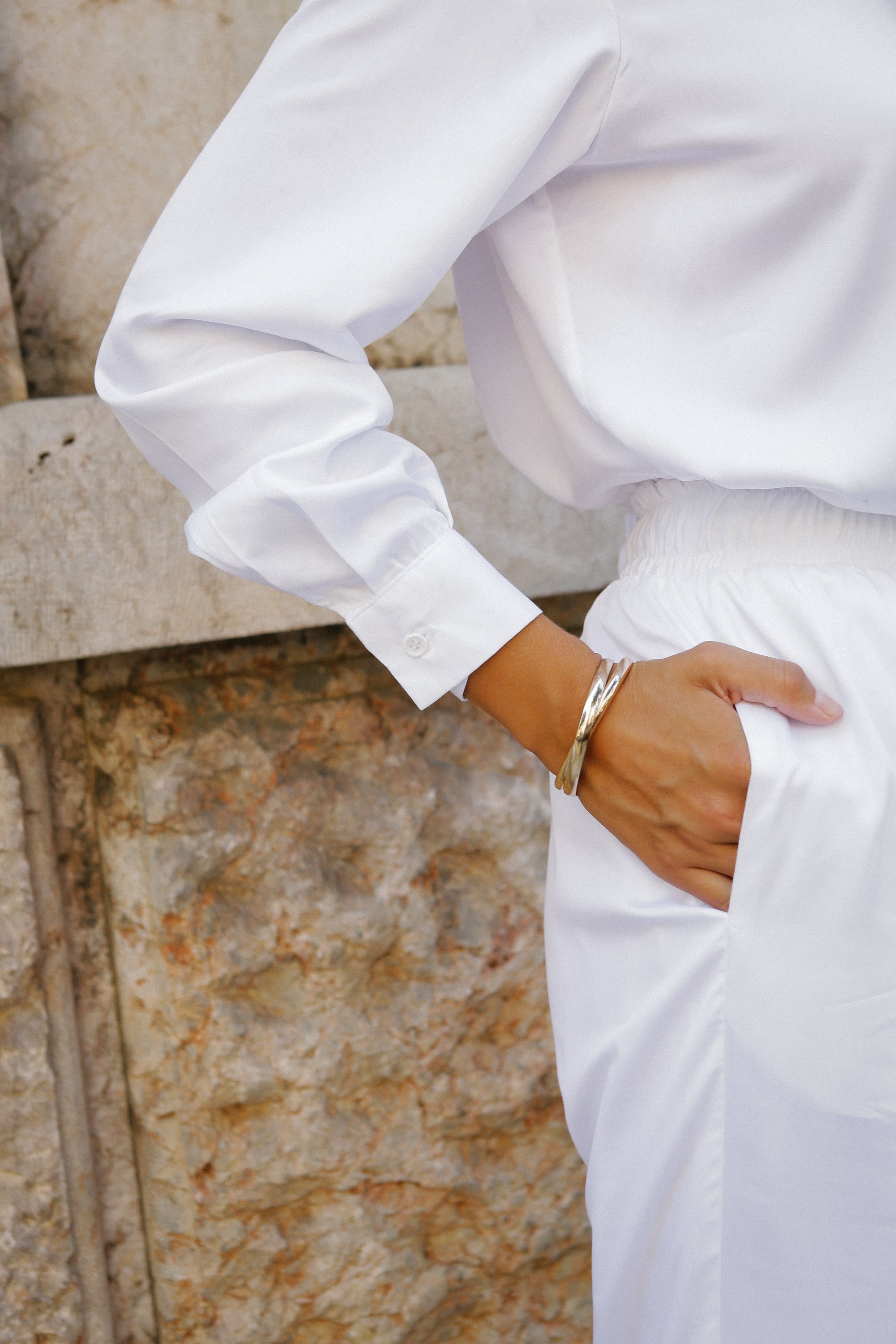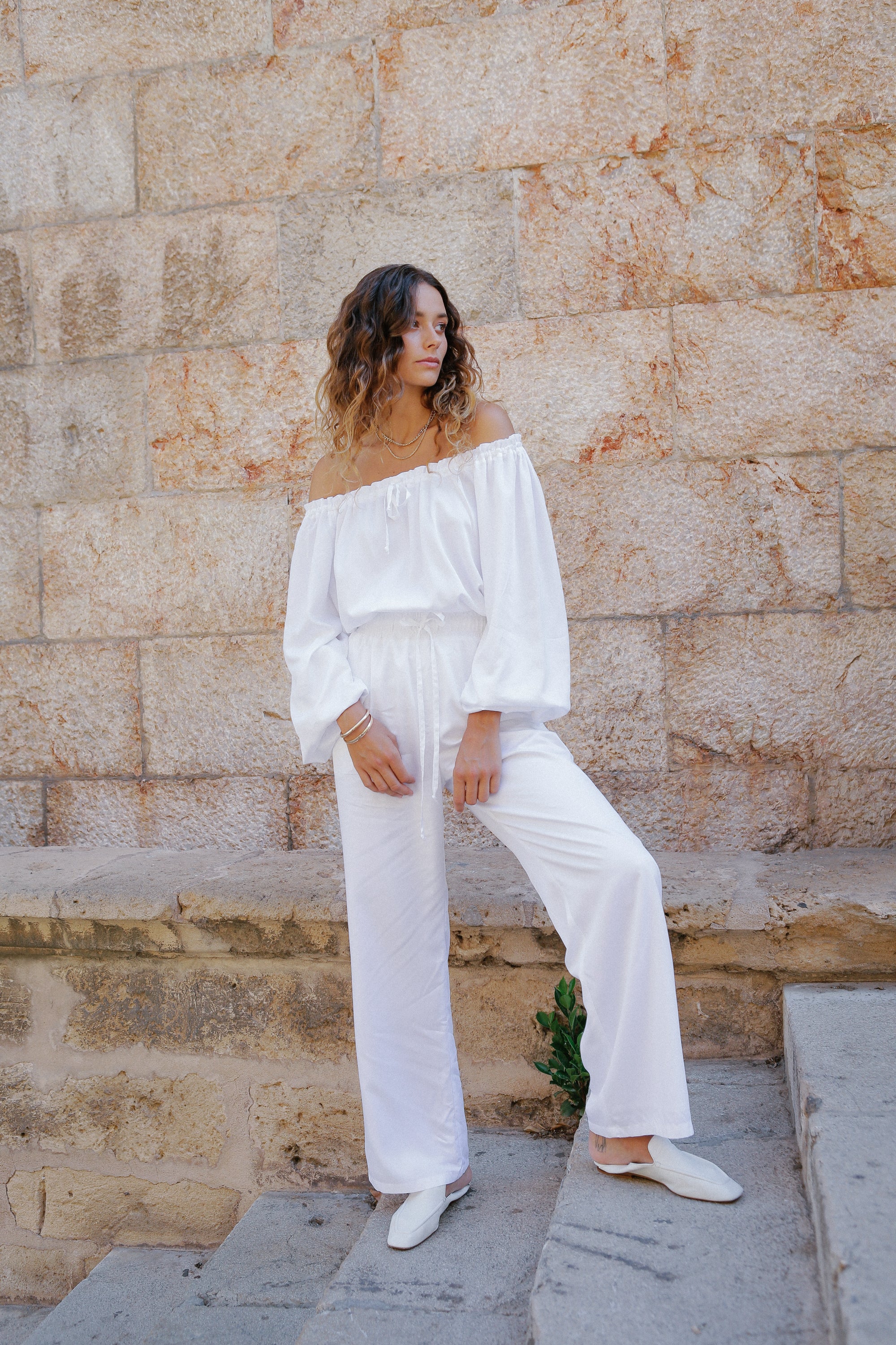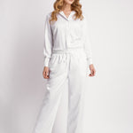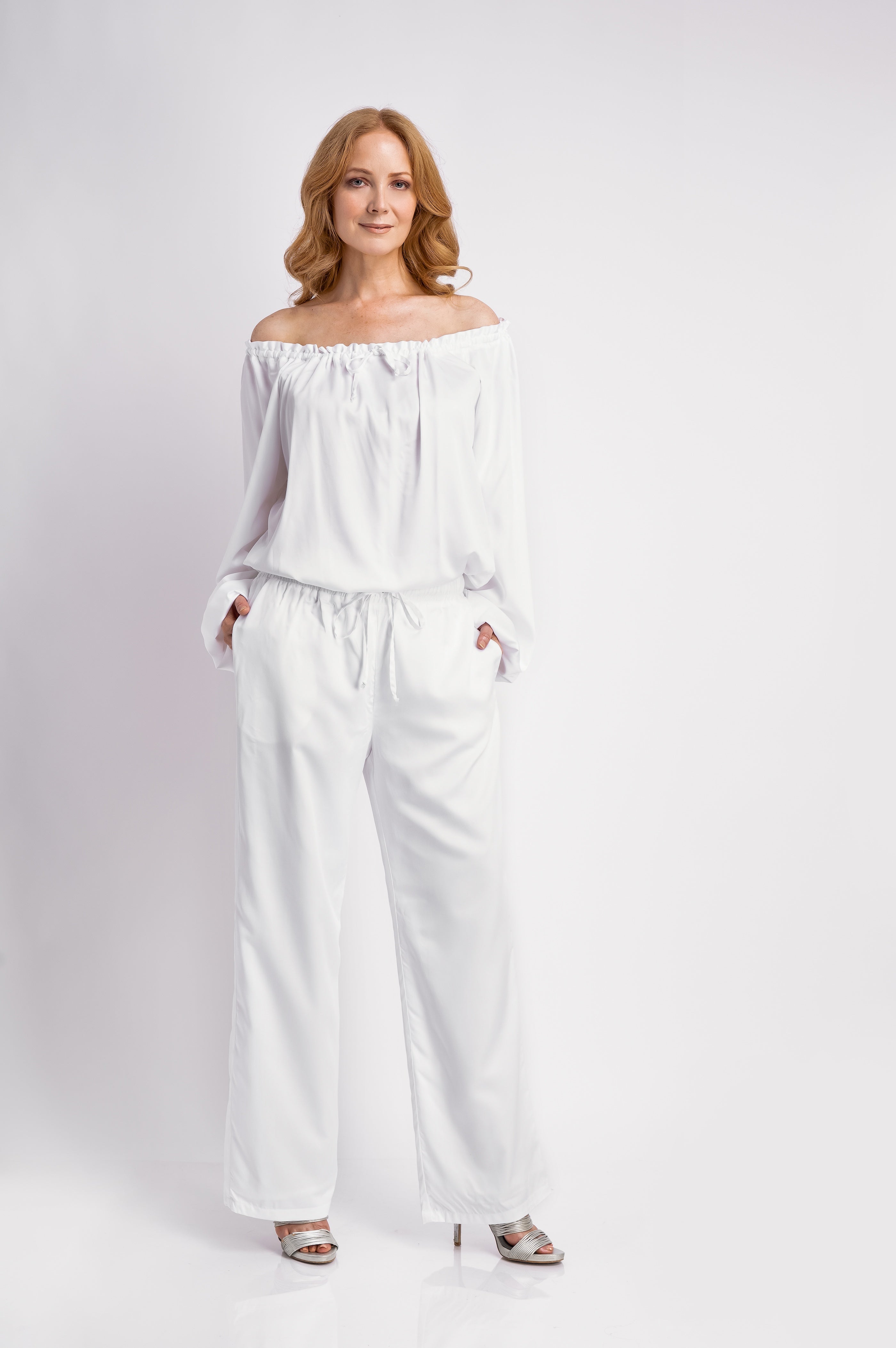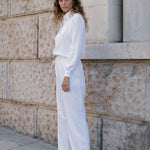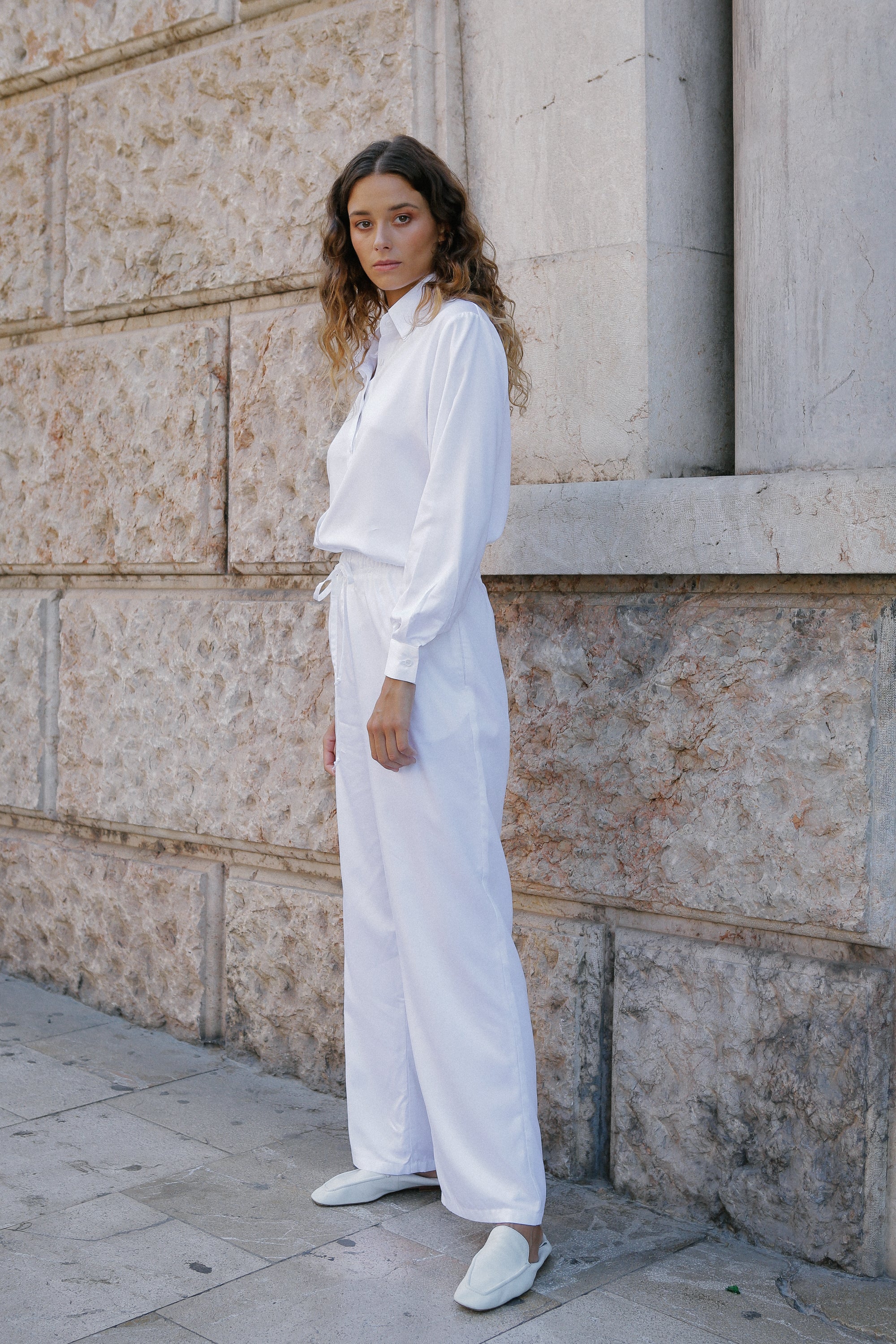 Loot to our wardrobe classics with a forward-thinking sustainable outlook. The Borne white silk pants will suit the smart-casual dress code. Made from organic bamboo silk with a drawstring waist and wide legs cut for optimal comfort.