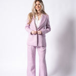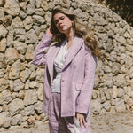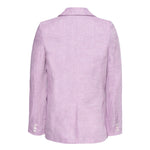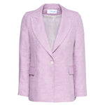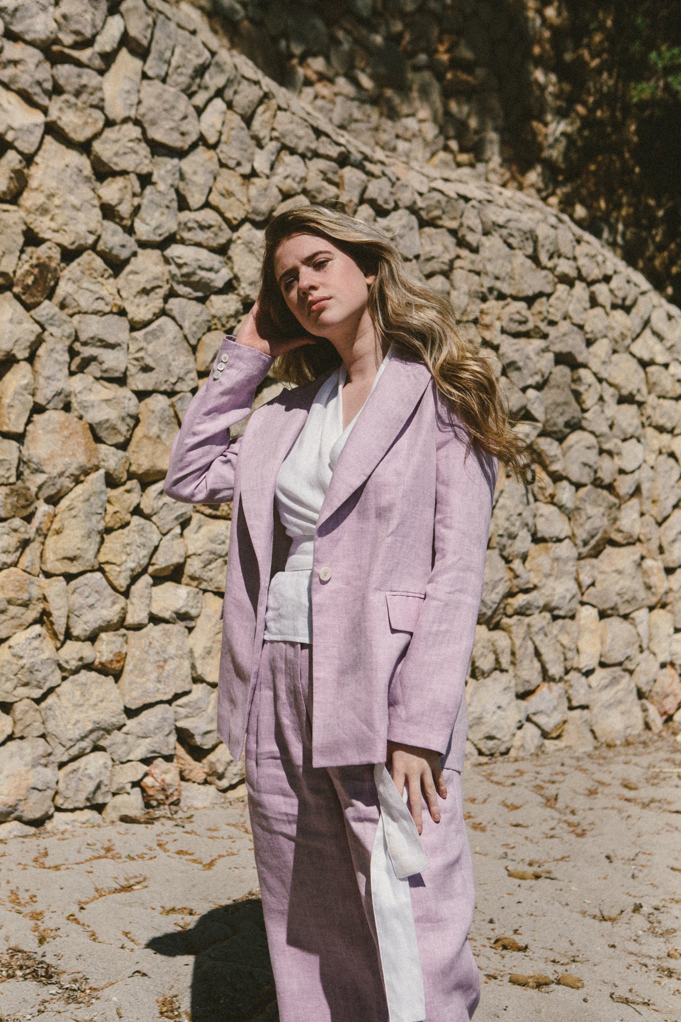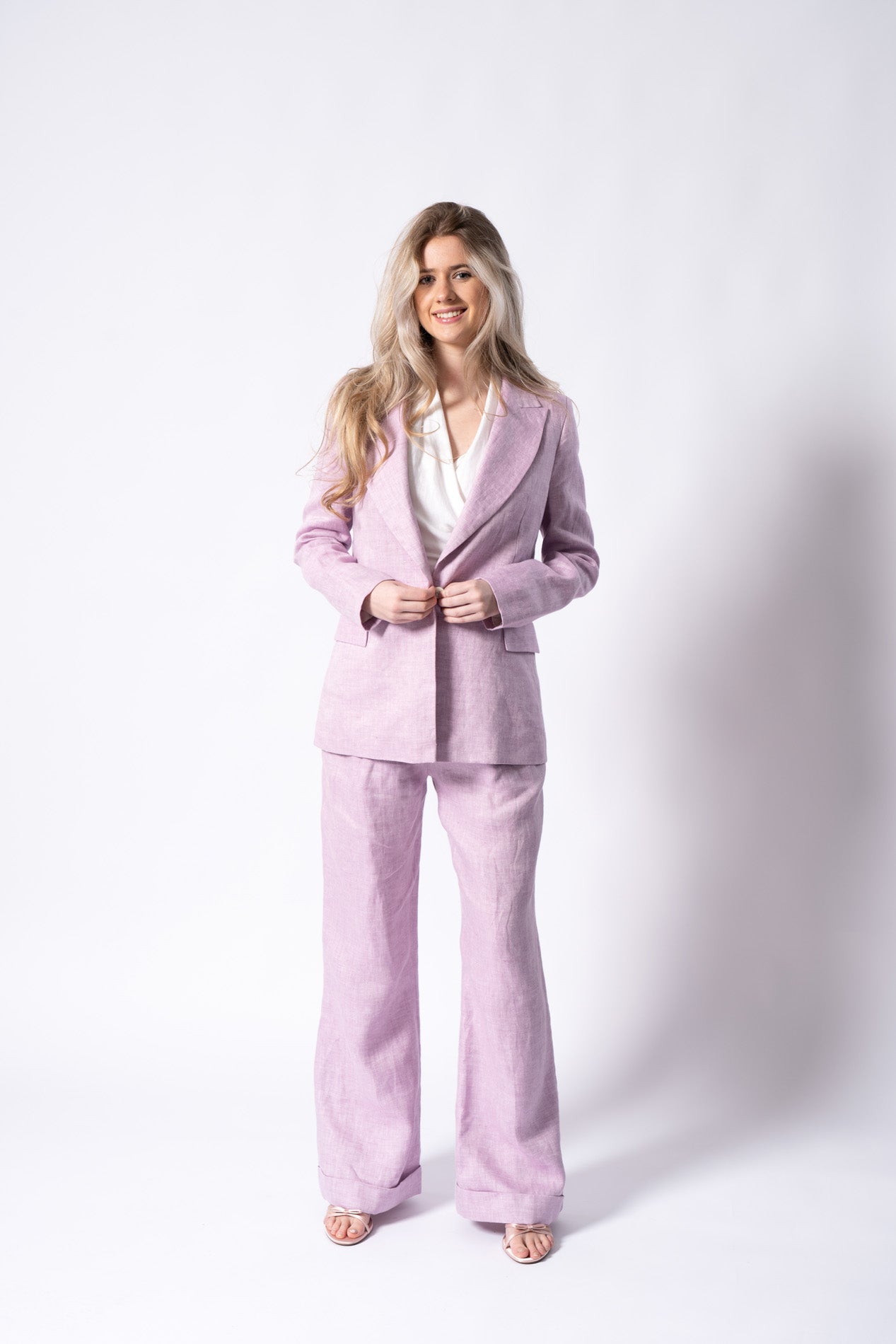 This modern pink blazer has been crafted in Ireland from linen with viscose lining. The design has a tailored silhouette: a peak lapel with a low single-button stance, padded shoulders for an articulated look, and pockets. Wear yours with our tailored pink herringbone linen ramblas pants, for a new take on wearing linen.