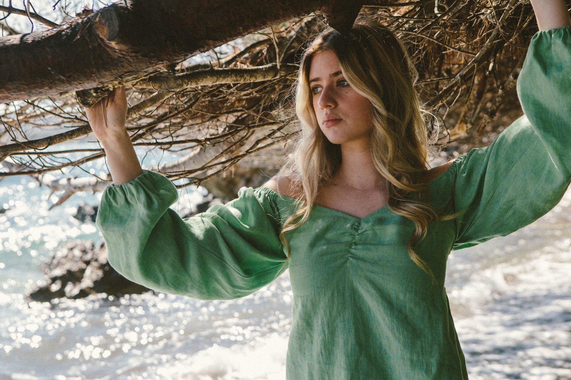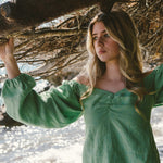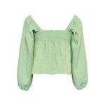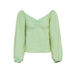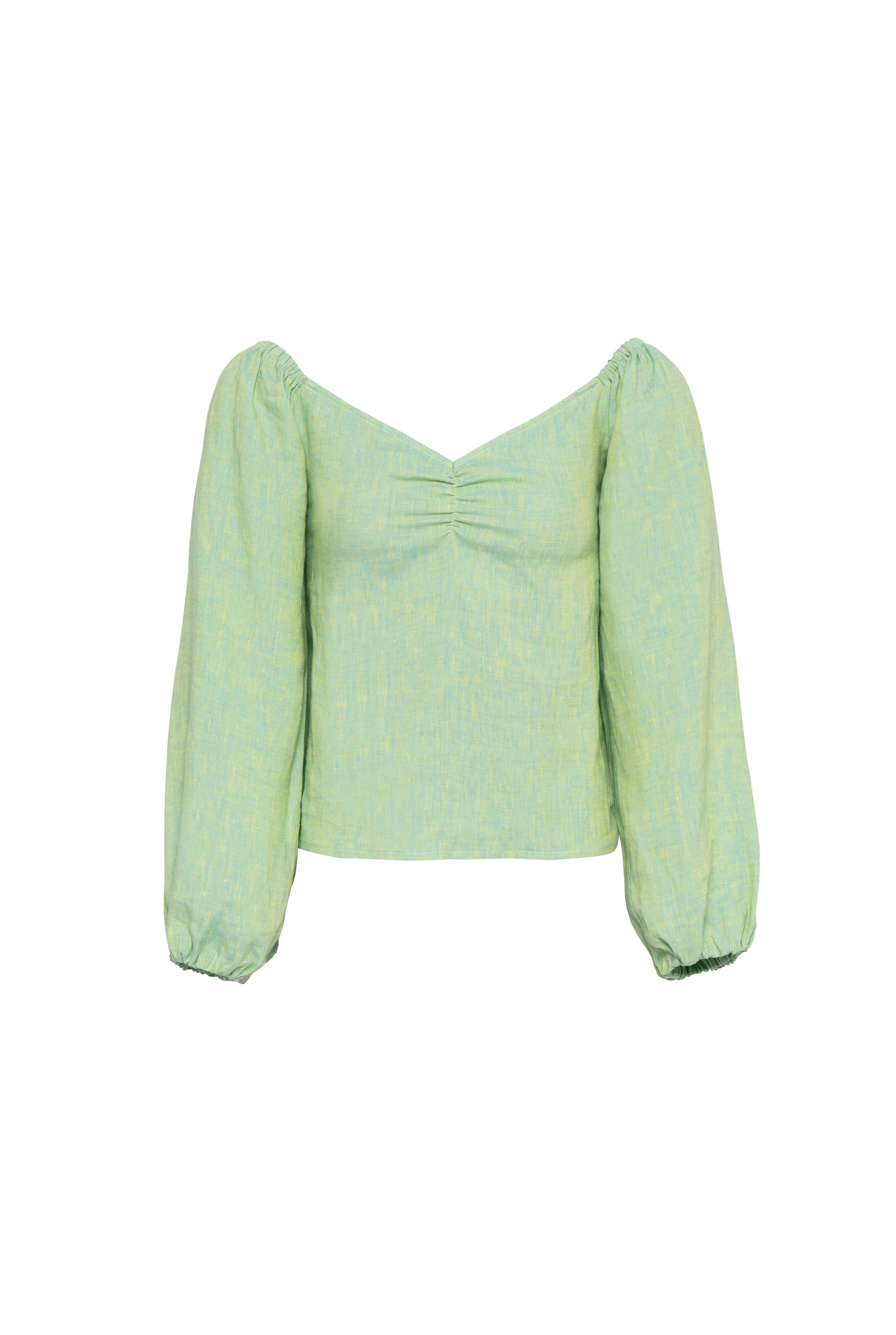 Freshen up your spring/summer wardrobe with this romantic green top. It is made from Irish linen and features romantic sleeves, a heart neckline, and a ruched back. This minimalistic and feminine look can be paired with any of the label's pants.