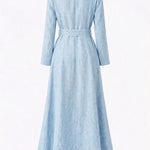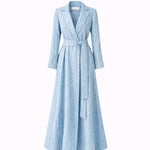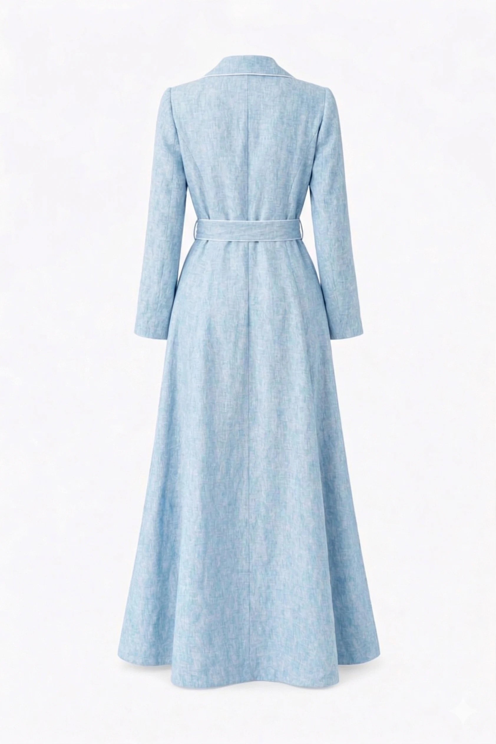 The Palma Maxi Coat in Sky Blue linen—a design born in Mallorca that has remained unchanged since its creation. Each season it returns in a new material, but the silhouette stays true to its original vision. Timeless in form, evolving only in fabric.